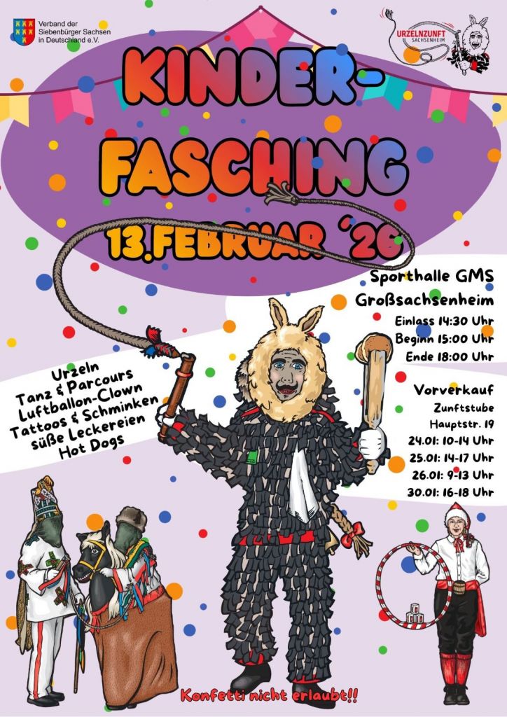 Die Urzelnzunft Sachsenheim e.V. lädt zum Kinderfasching am 13. Februar 2026 ein.