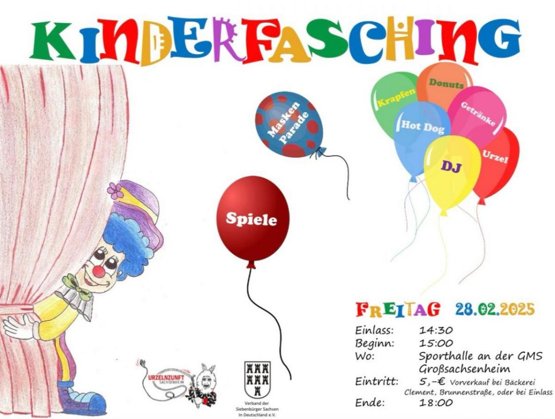 Die Urzelnzunft Sachsenheim e.V. lädt zum Kinderfasching am 28. Februar 2025 ein.
