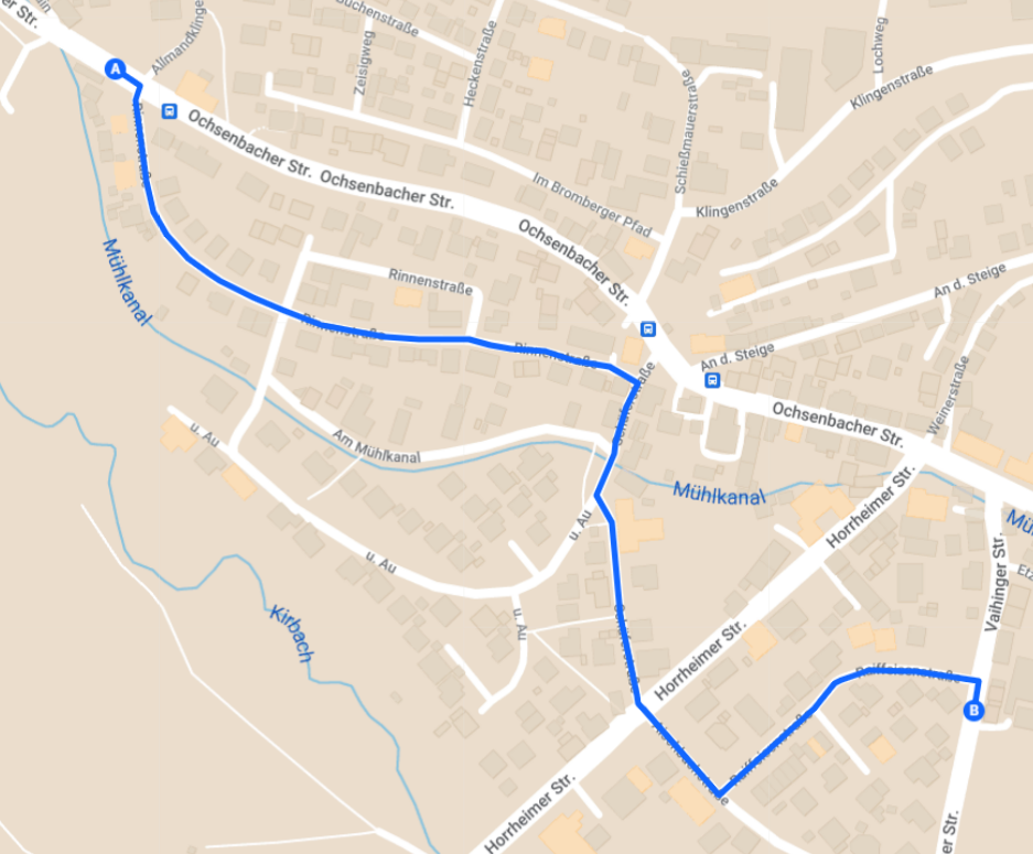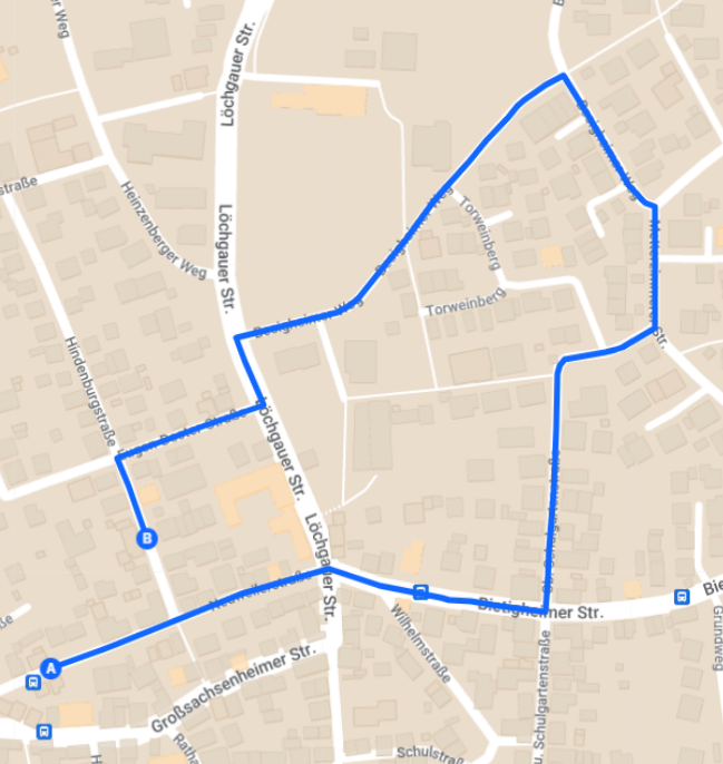 Start: Ecke Ochsenbacher Str. (Eisenbahn Knodel) - Rinnenstr. - Schäferstraße durch bis Horrheimer Str. - Dann wieder Einstieg in Busse (Parkplatz Volksbank).